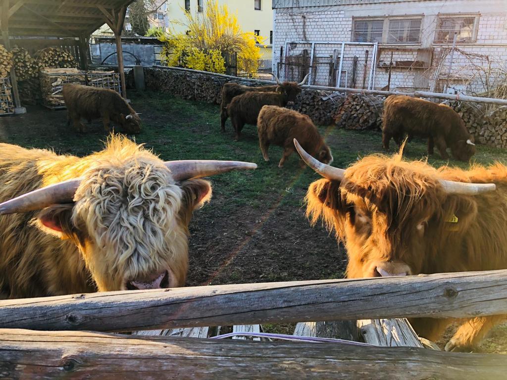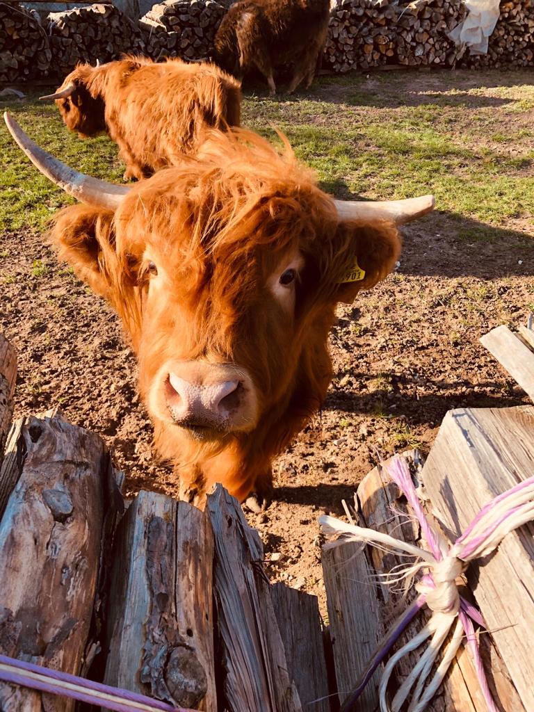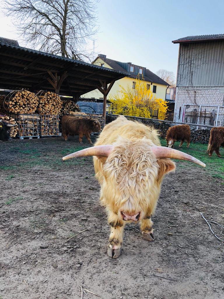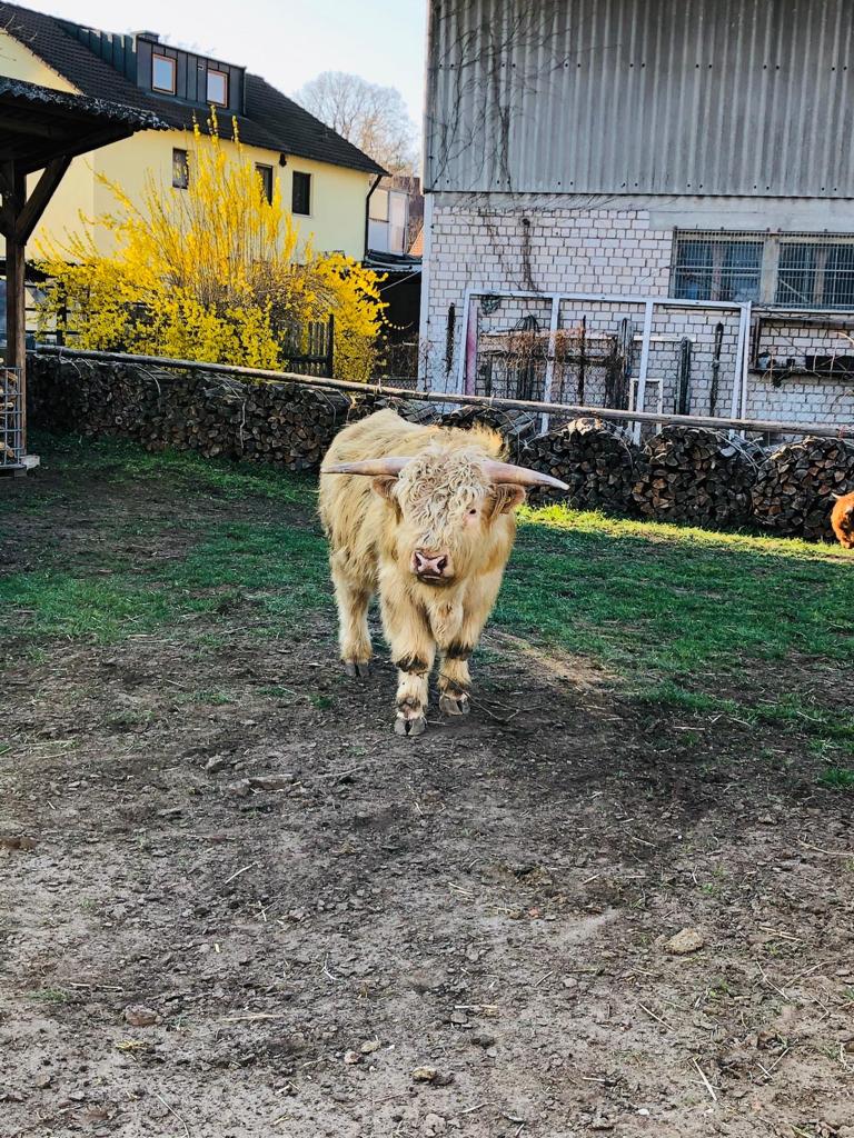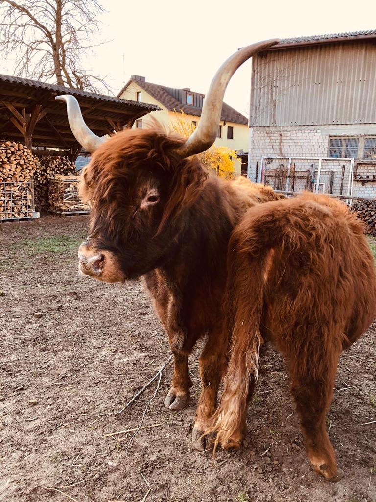 Unser Betrieb befindet sich im “Gässla”, im Herzen von Vach, neben der St. Matthäus-Kirche. Wir sind ein generationenübergreifender Familienbetrieb, dem die Landwirtschaft schon immer eine Herzensangelegenheit ist. Ende November 2018 haben die Highlands schottischen Wind in den Betrieb gebracht. In unserer Herde fehlte der männliche Part, weshalb wir nach dem perfekten Bullen gesucht haben. Allerdings wurden aus dem “einen Bullen” plötzlich sieben weitere Mitglieder. Somit wuchs unsere Herde in kürzester Zeit auf stolze elf Tiere. Und die Herde wächst und wächst… Unsere Tiere sind prima Gärtner und pflegen renaturierte Flächen. Dort leben sie artgerecht in extensiver Umgebung. Auf unserem Hof gibt es allerdings nicht nur Highlands zu bestaunen, sondern viele Arten mehr: • Fränkisches Fleckvieh • Uckermärker • Charolais • Limousin • Angus
